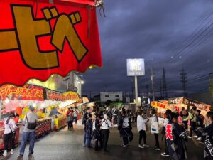 日が沈み、夜店の灯りがともる頃、大通りには続々と屋台が集まり、いよいよ袋井北祭り・第二部の幕が上がりました。
