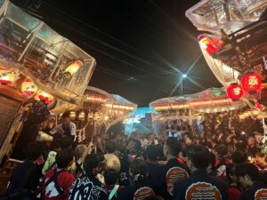 夜の連合は、昼の賑わいをさらに上回る熱気に包まれます。今年は11台の屋台が集結し、広々とした大通りが人と屋台で埋め尽くされ、勇ましい練りと活気ある掛け声が響き渡りました。